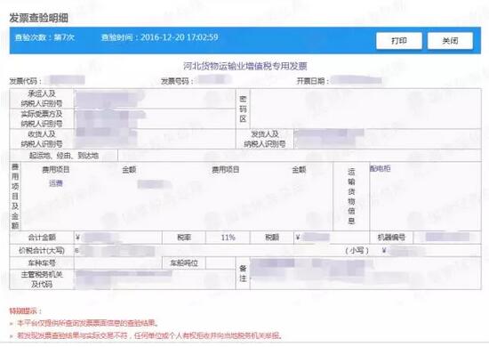 (6)本平臺(tái)僅提供所查詢發(fā)票票面信息的查驗(yàn)結(jié)果。如對(duì)查驗(yàn)結(jié)果有疑議,請(qǐng)持發(fā)票原件至當(dāng)?shù)囟悇?wù)機(jī)關(guān)進(jìn)行鑒定。
