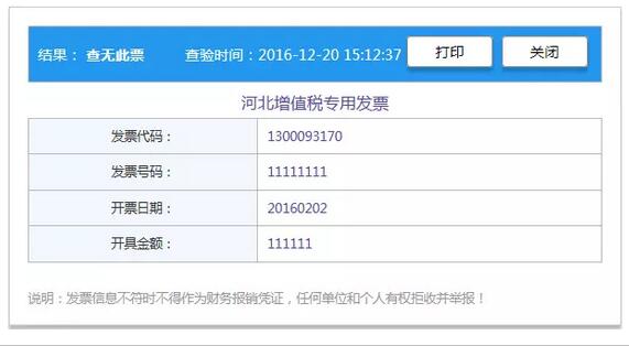 (4)查無此票:由于存在開具方離線自開票、發(fā)票電子數(shù)據(jù)的同步滯后(通常至少1天)、查驗(yàn)人錄入錯(cuò)誤等問題,導(dǎo)致相關(guān)發(fā)票在稅務(wù)機(jī)關(guān)的電子信息中無法檢索到。如果確認(rèn)輸入項(xiàng)無誤后,請(qǐng)于第二天再行查驗(yàn)。